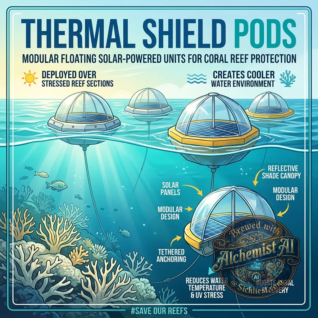 make a poster type of picture with the name "Thermal Shield Pods" at the top they are modular floating solar powered units directly over the stressed reef sections.