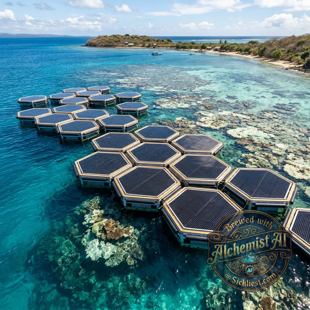 make a picture of an invention called "Thermal Shield Pods" which are modular floating solar powered units directly over the stressed reef sections.